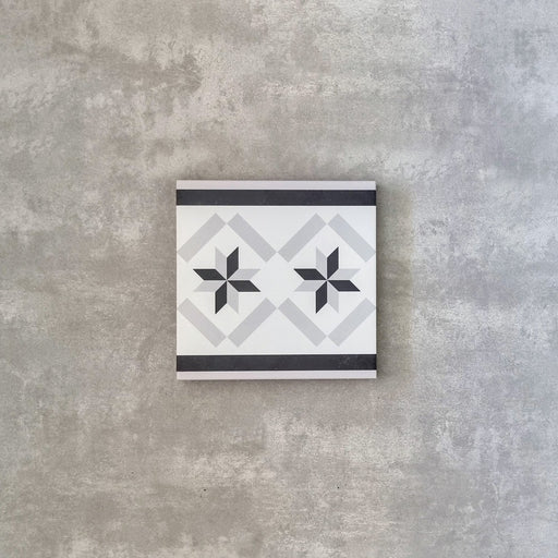 Canterbury Star Border is designed to complement the main décor tile within the Canterbury Star Collection, helping you create a classic framed Victorian floor with a polished, authentic finish. This 20×20cm square porcelain tile features a refined border design in soft grey, white, and black tones, echoing the collection’s signature star motif while adding structure and definition to your layout. The matt finish keeps the look understated and timeless.