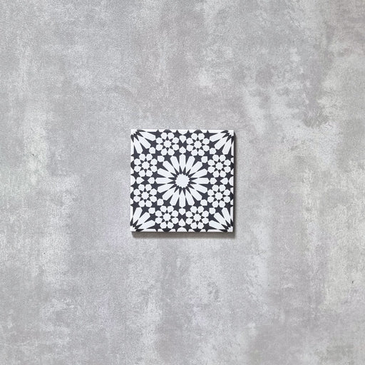 Fez Mini Winter presents the bold, graphic character of the Winter design in a compact 15 × 15cm square format. Featuring crisp black and white tones arranged in a classic Moroccan geometric pattern, this tile delivers strong visual impact while retaining a timeless, encaustic-style look. The matt finish softens the contrast slightly, giving the pattern depth and balance.