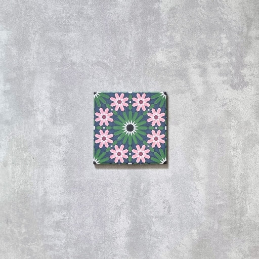 Fez Mini Autumn brings the rich, layered character of the Autumn design into a smaller 15 × 15cm square format. Featuring pink, green, blue, and white tones set within a bold Moroccan geometric pattern, this tile captures the look of traditional encaustic cement tiles with the practical benefits of porcelain. The matt finish enhances colour depth while keeping the overall look balanced and refined.
